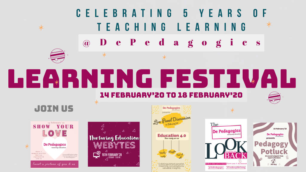 In 2015, De Pedagogics started with a passion of nurturing education with 3 key people as founder evangelist. Now, five years later, we have very successfully built a thriving community of people who are equally passionate about nurturing education and value our proposition. We are flying strong with thousands of people who engage with us via face to face, virtually and on social media for professional learning sessions, mindshare, and contribute wonderfully partnering with our team of 15 members. We owe much to our partners like Microsoft, Adobe, Apple, Cambridge University Press, numerous K-12 schools and higher education institutes within India and those in UAE and China for placing their trust in us to drive learning into classrooms. We are happy to celebrate your enthusiastic support combined with our bold vision through 5-day Learning Festival!