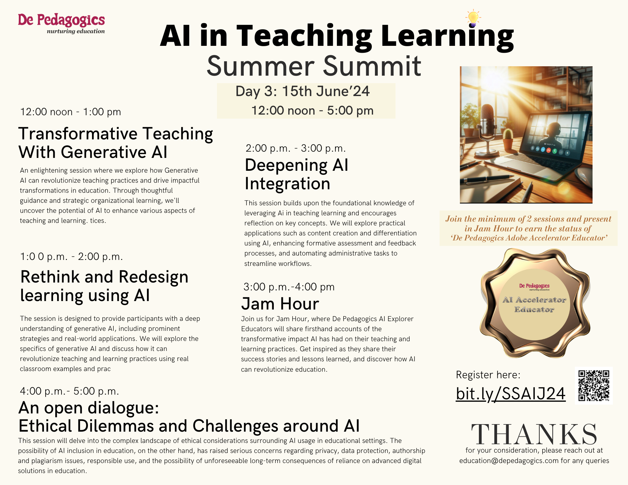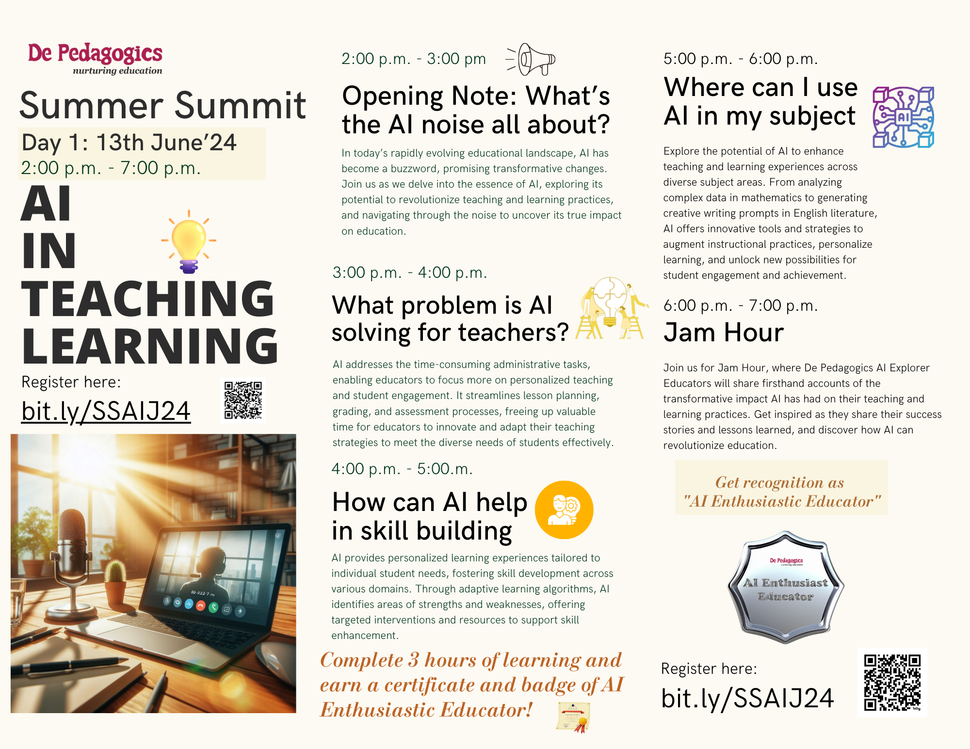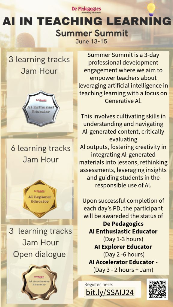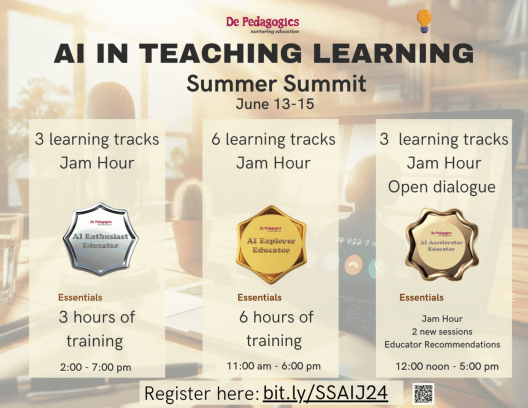 Join us online onย 13-15 Juneโ24ย for an immersive learning experience where educators like you can explore cutting-edge AI technologies, innovative pedagogical strategies, and practical applications for enhancing student learning outcomes. From interactive workshops to inspiring JAM sessions, this summit is designed to empower you with the knowledge and skills needed to harness the power of AI in education.